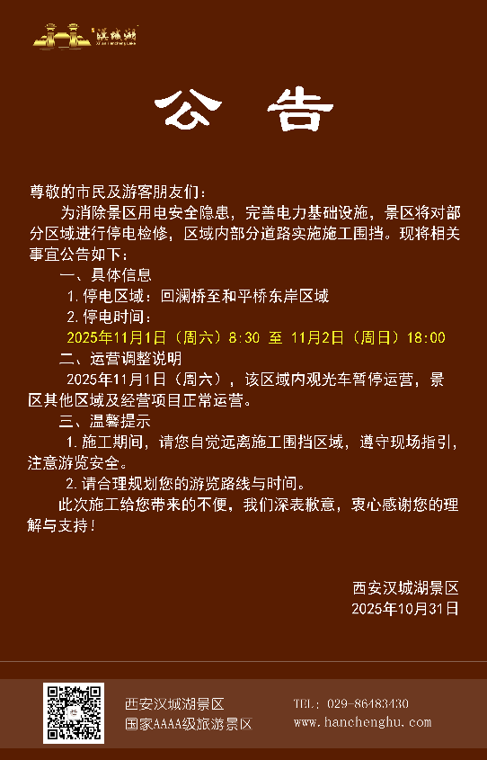 关于汉城湖景区部分区域停电检修施工围挡的公告